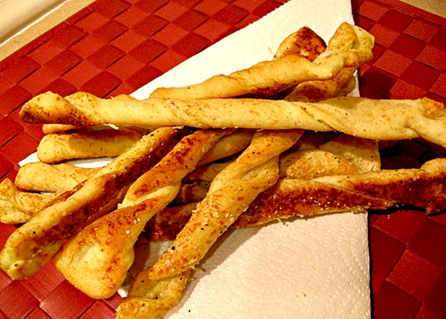 Roll out thinly and cut into ˝ inch strips about 8 inches long, twist the strips and place on a baking tray.